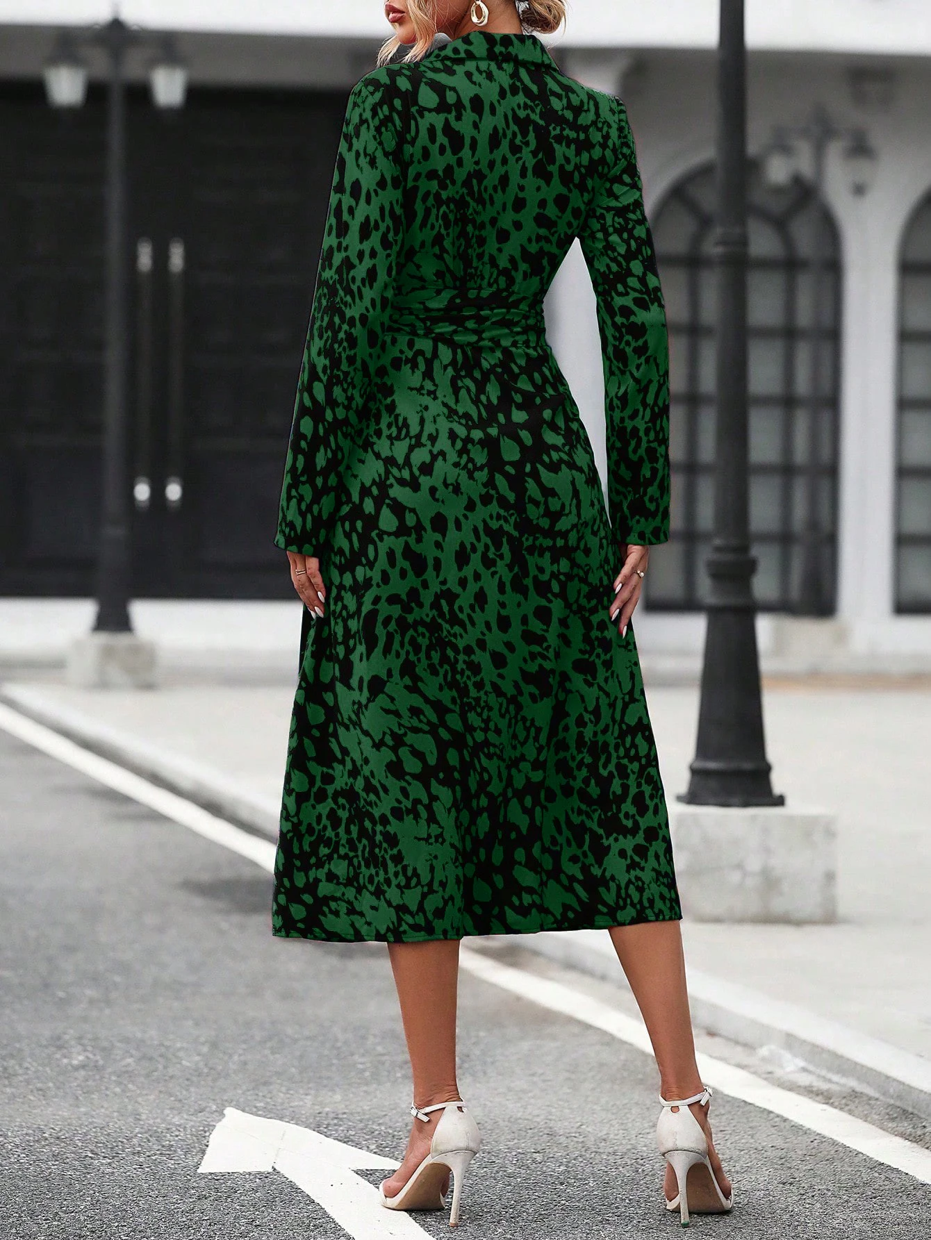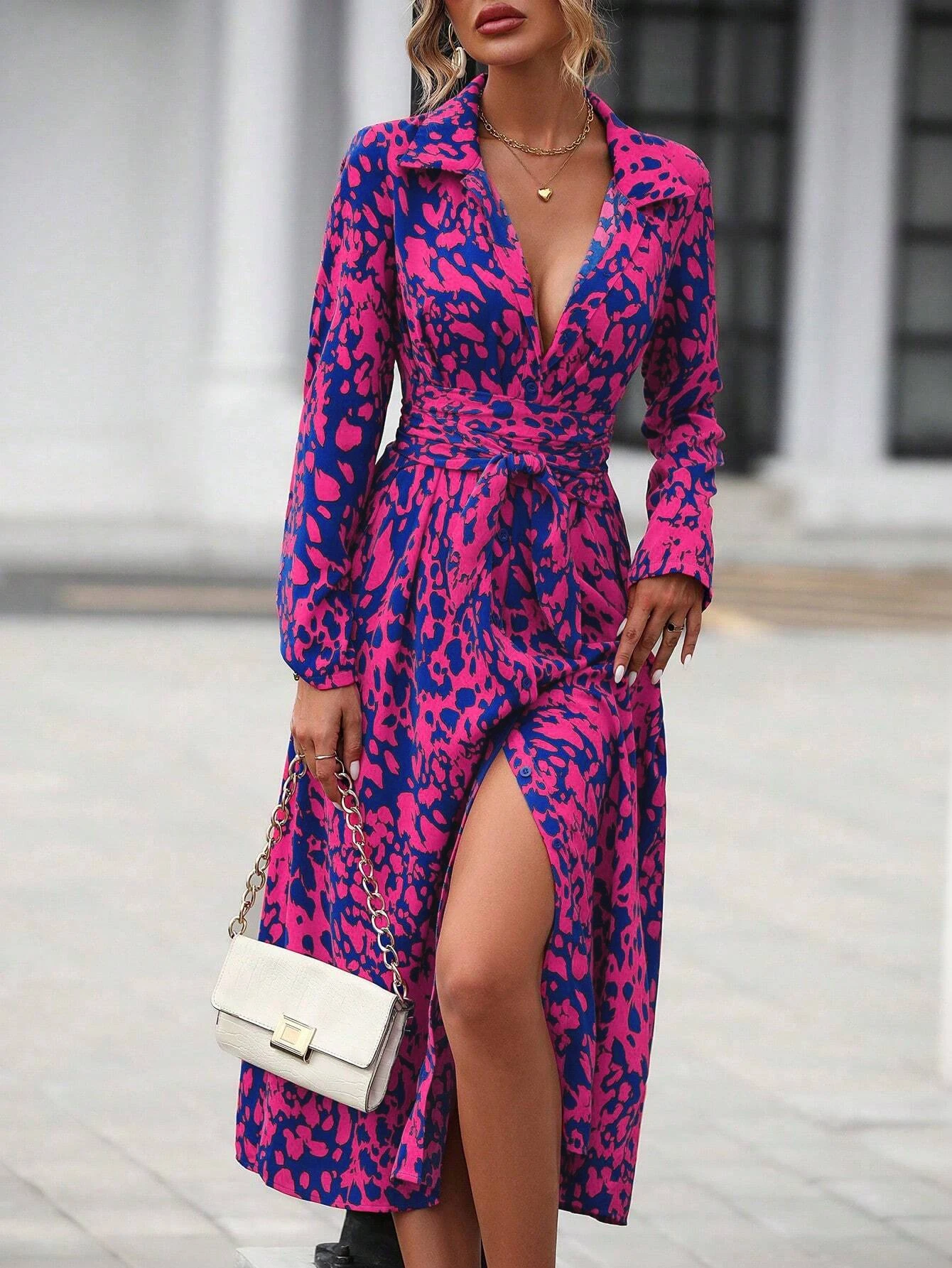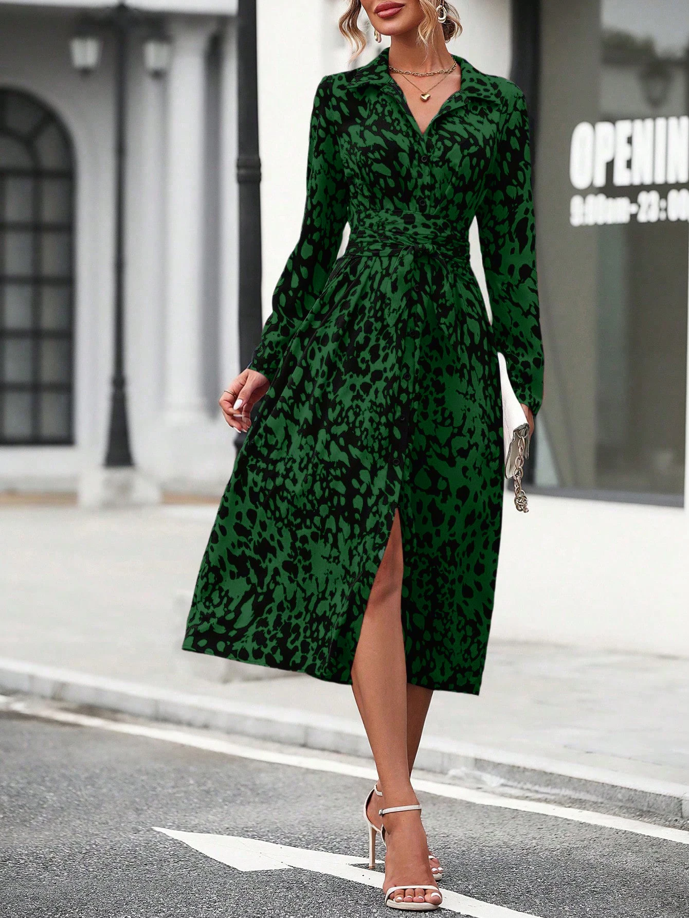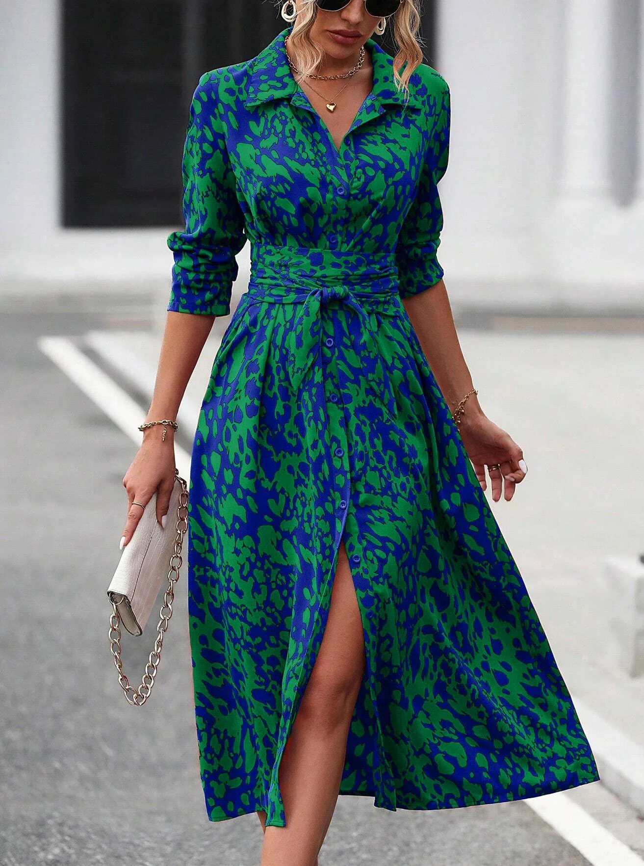 Elegant Random Print Button Down Shirt Dress Women's Long Sleeve Belted Waist Midi Dress Spring Fall Office Casual Dress