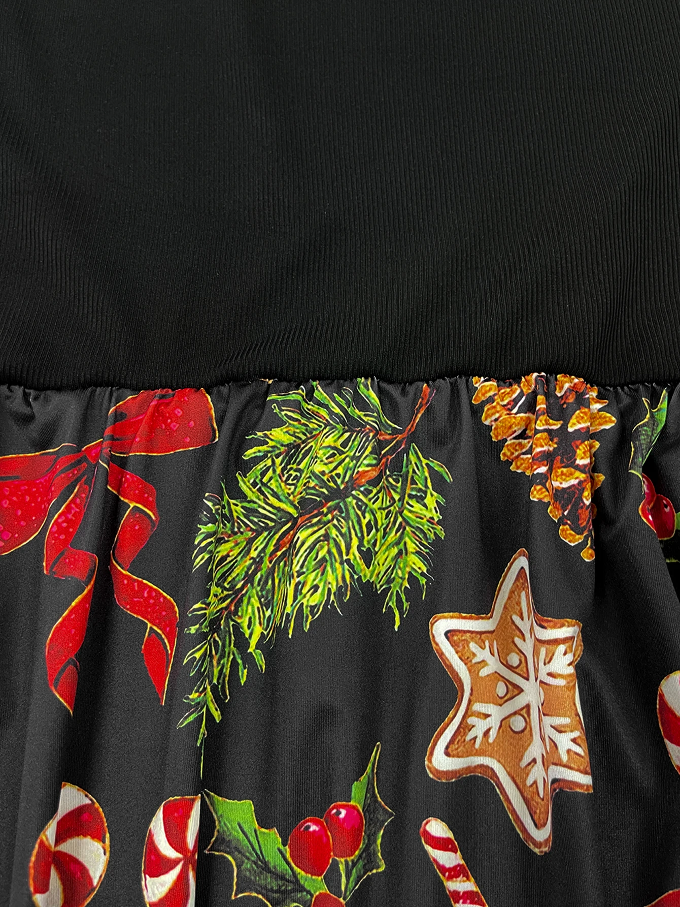 Plus Size Women's Super Cute Christmas Print Dress, Long Sleeve Gingerbread & Candy Pattern Midi Dress, Festive for Holiday Part